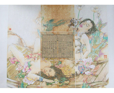 LIU YAN Flower were Floating (Dreamland Series) 2009 Chinese ink and color on ancient book paper and Japanese paper 70 x 60 cm. view larger image