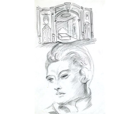 GUNTHER GERZSO Architecture and Portrait of a Woman c. 1935-1941 black crayon on paper 12.625 x 10.375 inches