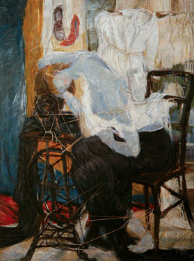 YOU KHIN Woman Dozing Off on Her Sewing Machine 2007 (Cambodia) oil, strings on canvas 109 x 82 inches