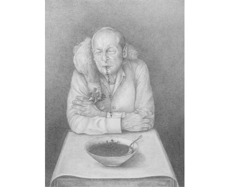 MARIANELA DE LA HOZ Eating so much hatred made me sick Comer tanto odio me hizo dano 2009 silver and gold point and graphite on paper 6.5 x 4.9 inches