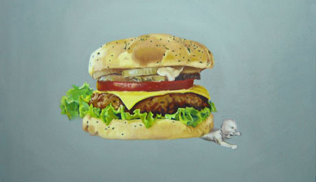 struggles to crawl out from under an artery-clogging jumbo cheeseburger. Set in front of flat backgrounds,